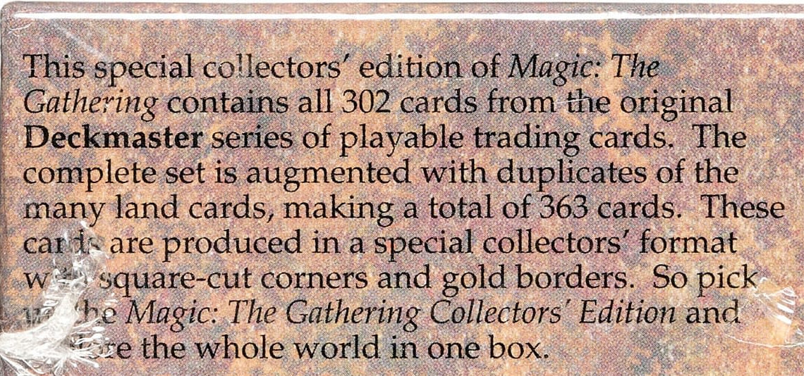 In an effort to meet the unexpected demand of Magic: The Gathering™ (and to quell public outcry about the difficulty of acquiring all the cards), Wizards of the Coast (WotC) decided to print a “Factory Set.” This set, named the Collectors’ Edition, was released in December 1993, within days of the release of the Unlimited Edition. It retailed for a price of $49.95 and contained a full set of all cards released in the Limited Edition of Magic.